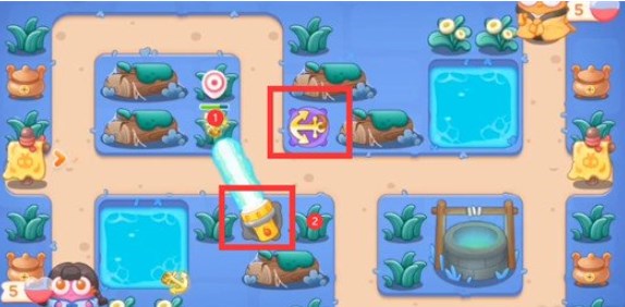 1.开局在下方位置放置一个手电筒,一个船锚塔,锁定小草,依次拆除周围的道具;