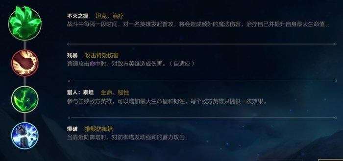 打团中狗熊是一个是非常怕控制的英雄,所以可以利用泰坦的韧性保证我们追击敌人,并且泰坦可以提供额外的生命值有利于我们w的伤害和E的护盾值提升