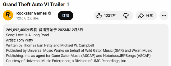 观看量突破 2.69 亿,《GTA6》预告片成 YouTube 历史最热非广告预告