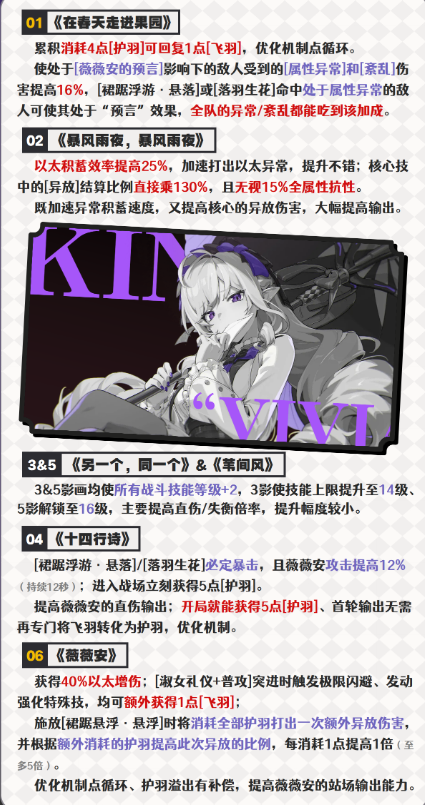 1、影画一:提高全队的异常伤害,提高薇薇安的异常积蓄速度,提升飞羽产出。
