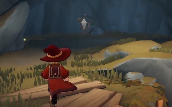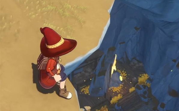 在左下方可以发现几块木板结构,并能看到一名NPC角色。此时召唤飞行坐骑,朝该人物所在位置飞行。落地后会出现一个洞穴入口,进入洞穴内部后,左侧设有一架木质梯子。攀爬上去后继续前行,即可抵达信仰者之村的核心区域——魔力之源所在点。